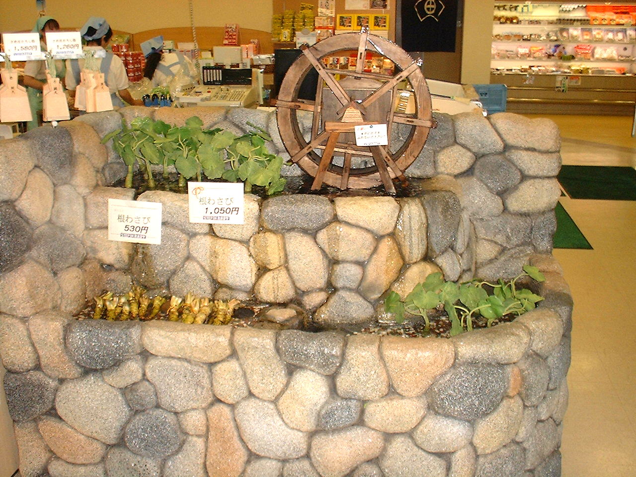 山葵田の模型には水が張ってあり、そこで根わさびを販売しております。
